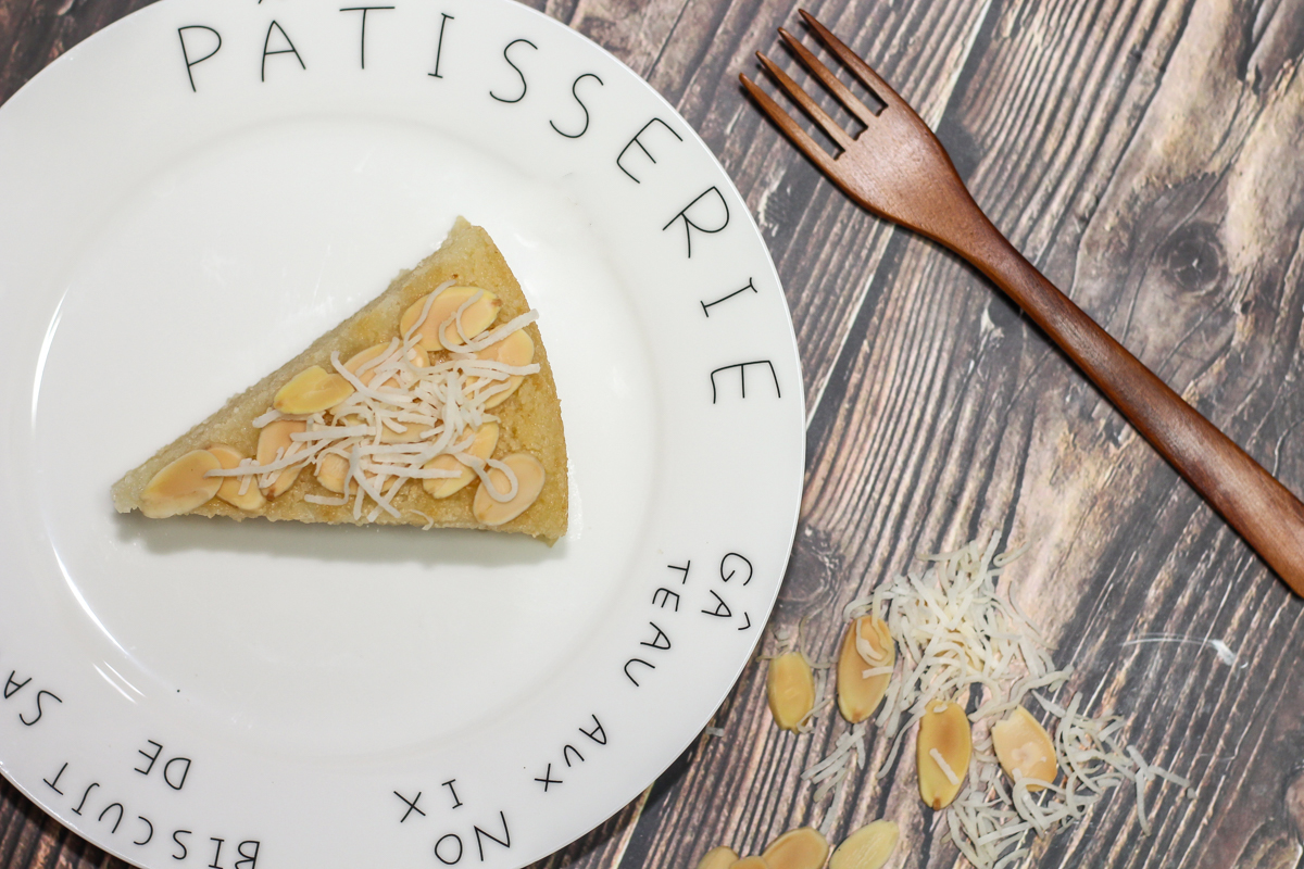 This Basbousa Recipe – Semolina Cake is dense yet soft and has a melt-in-the-mouth texture. I cut the basbousa into wedges although they are often cut into little squares, like brownies, as it is pretty rich and sweet. I topped the basbousa with almonds and coconut flakes. I think chopped pistachios would be good too!