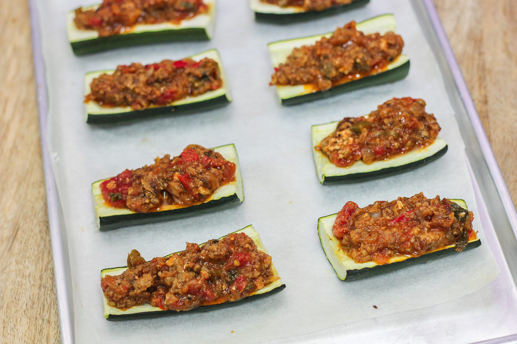 - Stuff zucchini with beef bolognese and top with shredded mozzarella.