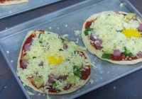 - Bake the pizza for 10 minutes or until the crust is golden, the cheese is melted and the egg yolks are cooked.