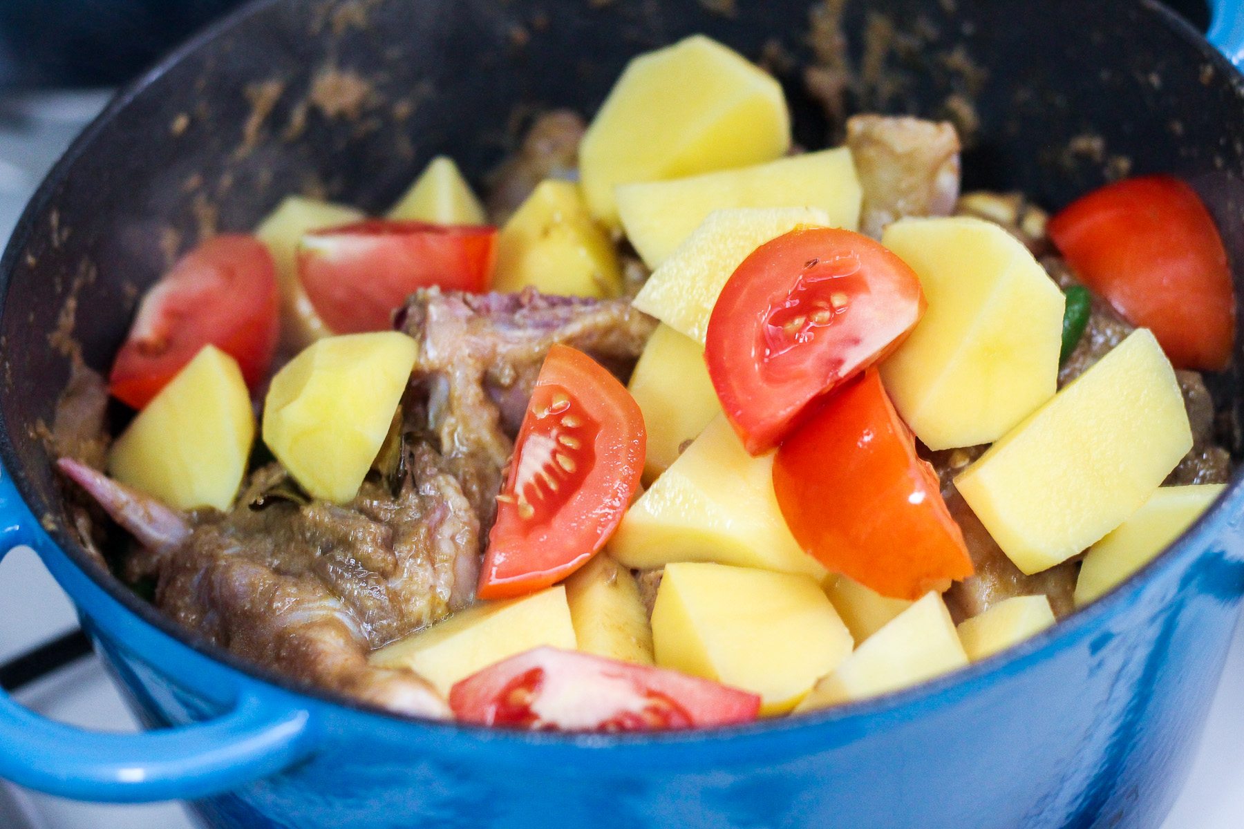 8. Mix the potatoes and tomatoes and enough water to cover just half of the chicken.