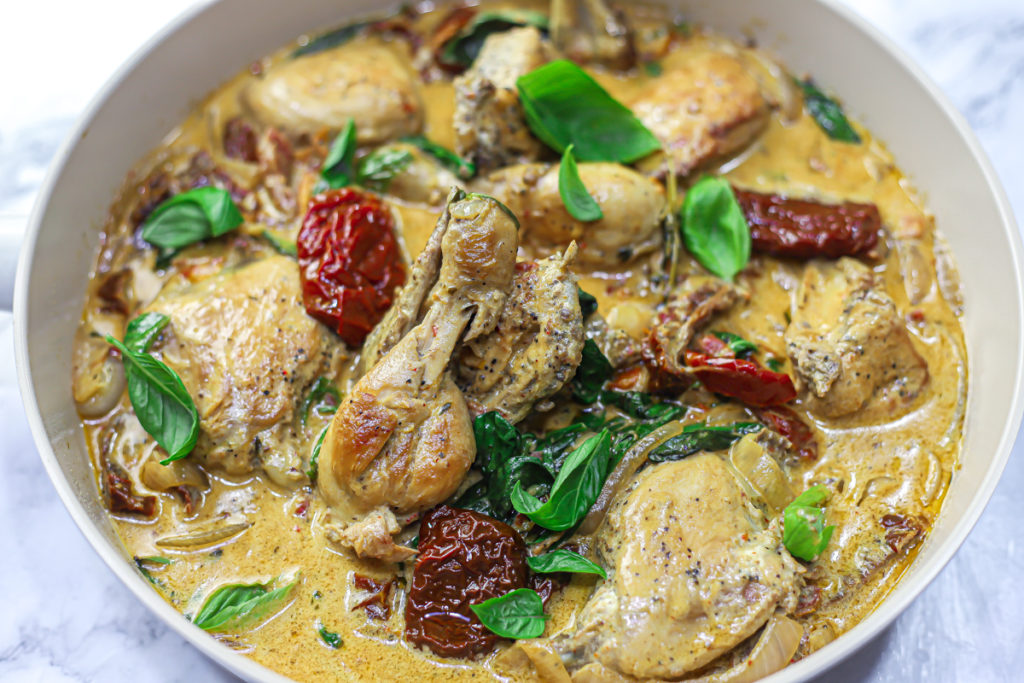 So today I would be sharing this Creamy Sun Dried Tomato Chicken recipe. It is a dish made with only a few ingredients, including a handful of seasonings and herbs that you probably already have in your pantry. That makes it even easier to pull together in a flash. Despite it’s simplicity, these chicken turns out amazing and really flavorful. One of the reason is; the recipe utilizes the flavorful oil from sun-dried tomatoes to brown the chicken pieces, adding depth and aroma to the dish. You can choose to use a whole chicken, cut into manageable eights, or substitute with your favorite cuts like thighs or breasts.