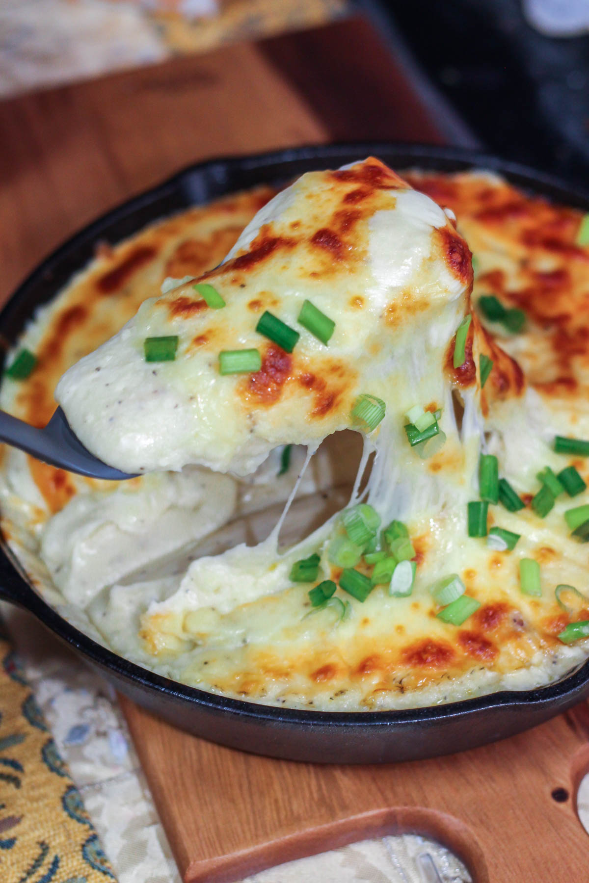 We are talking about butter + sour cream + cream cheese + cheddar cheese all amalgamated in ONE dish! And do not forget the mozzarella cheese topping that is grilled to golden perfection.
