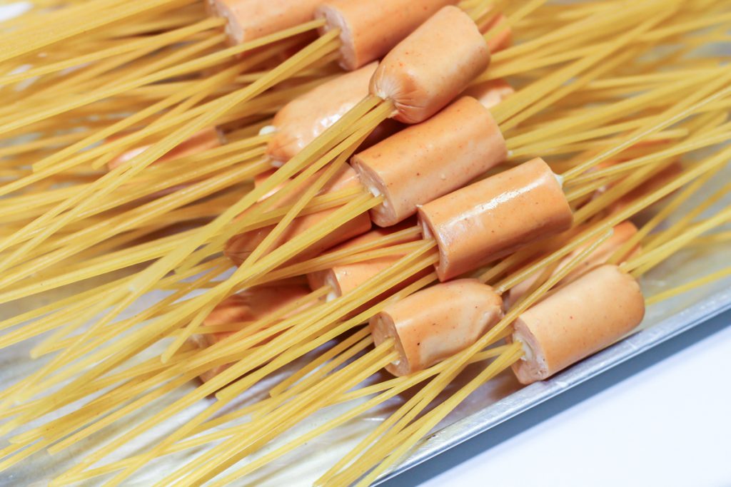 - Poke about 5 spaghetti in each sausage. There would be some leftover spaghetti, just boil this as per normal.