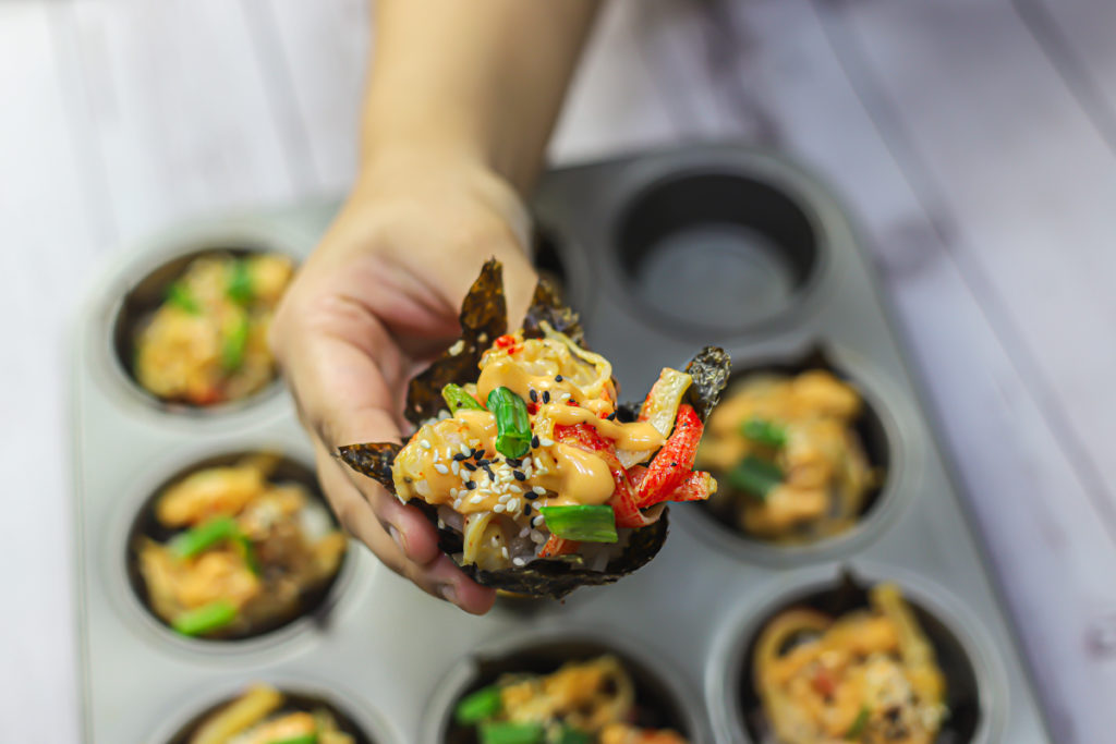 Baked sushi has gained popularity but it is even more fun to eat when it comes in little cups like these. Creating these sushi muffins is a breeze. Begin by cooking some sushi rice and then seasoning it with some sushi vinegar. Although you can create your own sushi vinegar by mixing rice vinegar, salt, and sugar, pre-made sushi vinegar is easily accessible. Still, I suggest adding a bit of sugar and salt to enhance the flavor, even when using pre-made sushi vinegar.