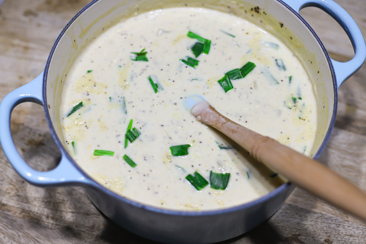 - Add the milk and continue cooking the potatoes till tender.