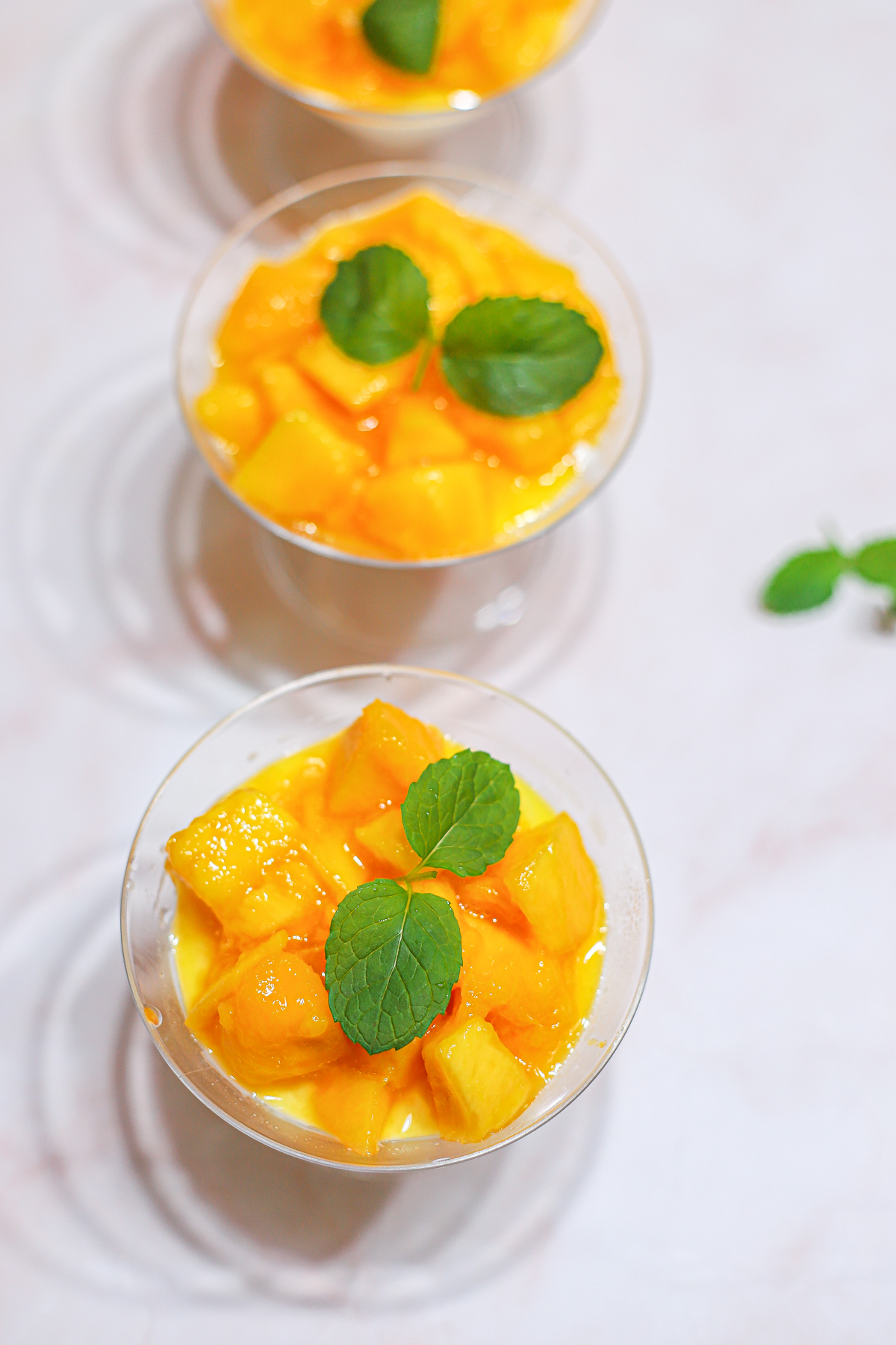 4. Top the panna cotta with the mango chunks and mango coulis.