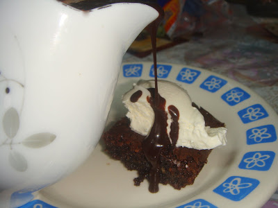So we were supposed to bake something to munch all. It all started with us browsing thru Nigella Express trying to find the chocolaty cookies. Somehow we ended up baking her Flour-less Brownie instead. The brownies tasted nice on it’s own. But with the chocolate sauce, it was so so so so good! We served it with a scoop of ice cream too. SUPER DELICIOUS AND GORGEOUS!!!!