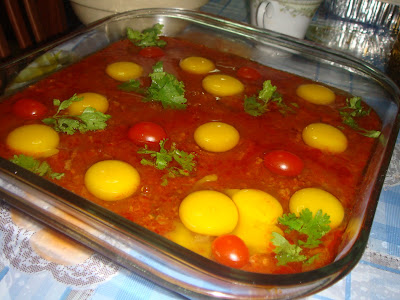 - Pour Shakshuka in a large Pyrex dish and crack egg each in a different side of E dish. Bake for 15 mins.