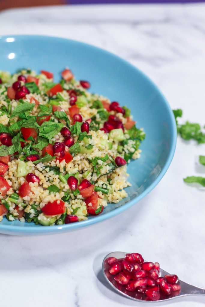 If you are trying to eat healthier but running out of options, this Tabbouleh recipe is definitely for you. It also makes a good meal prep. Use it in wraps or use it as a base for your proteins. The options are limitless. I added some garlic, cilantro, pomegranate seeds and cucumber to this Tabbouleh recipe which is not a norm. There are other recipes adding some spices to it too; like a pinch of cumin and coriander. Feel free to make it your own.